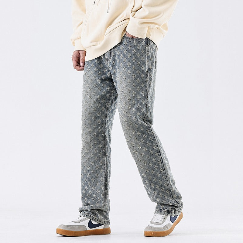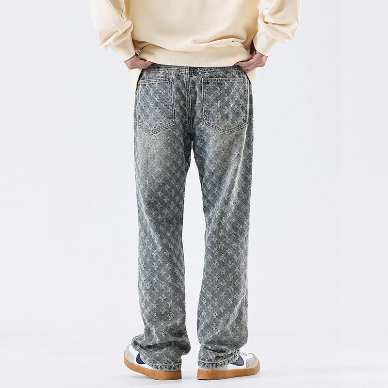 Crafted with an intricate textured pattern and durable denim, these jeans deliver a fresh take on the classic straight-leg design. They are built to pair seamlessly with oversized hoodies, casual tees, and everything in between.