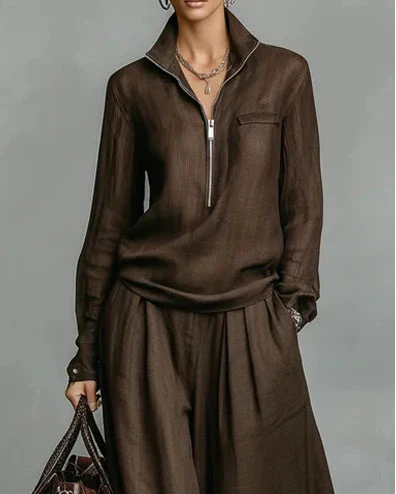 Vintage ease meets modern refinement in the Tara Vintage Set™, a relaxed yet polished two-piece designed for effortless everyday elegance. Featuring a softly structured zip-neck top and fluid wide-leg trousers, this set delivers comfort without sacrificing style—perfect for days when you want to look put-together with zero effort.