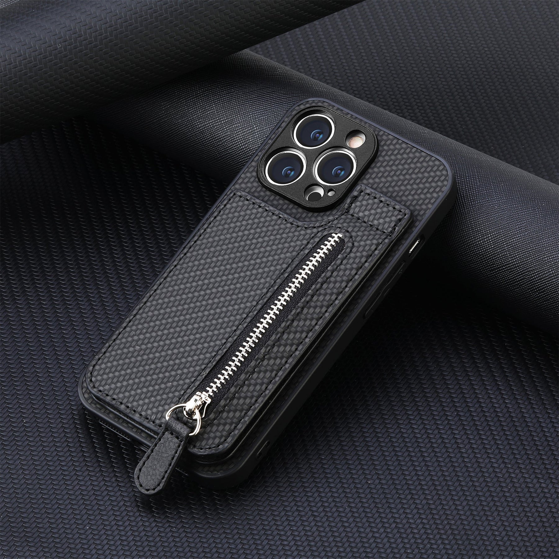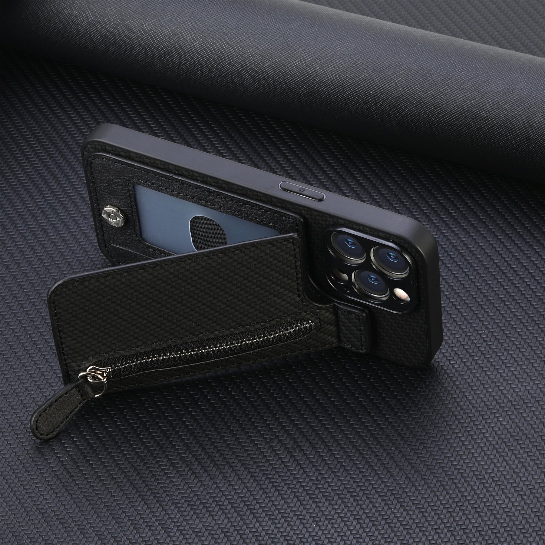 Finished in a woven leather design, this case offers a durable shell with a built-in zipper compartment—balancing a sleek design with convenience that keeps your pockets light.